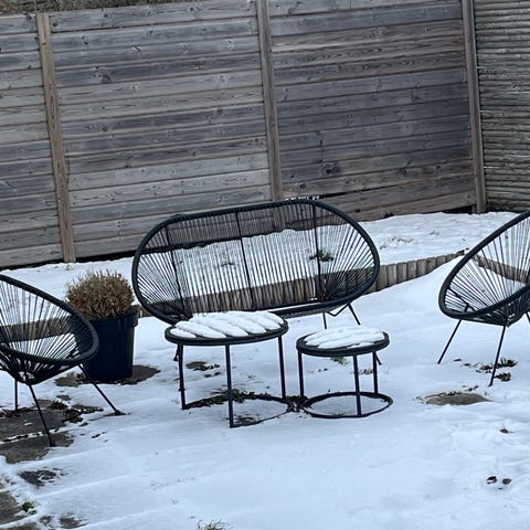 Et bord, to stole og en stor bænk. (ikke den lille compact)