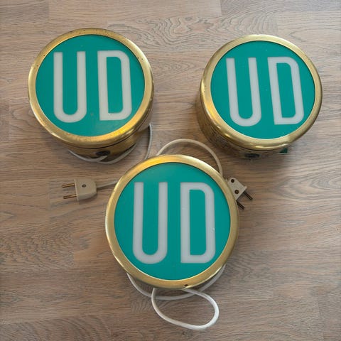 Retro skilte med “UD”. Gamle nødudgangsskilte fra Louis Poulsen. Super fine. Trænger tilsat blive pudset op. Forskellige pileretninger. Alle er komplette. Der er tilbehør ved siden af.
