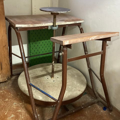 Fin gammel snedkerbænk - den er ikke så høj, men kan jo forhøjes med nogle klodser hvis det skulle være et problem. Det kommer jo også an på hvad den bruges til. Fin til værkstedet eller som brugskunst til butiksvinduet eller til børneværelset.