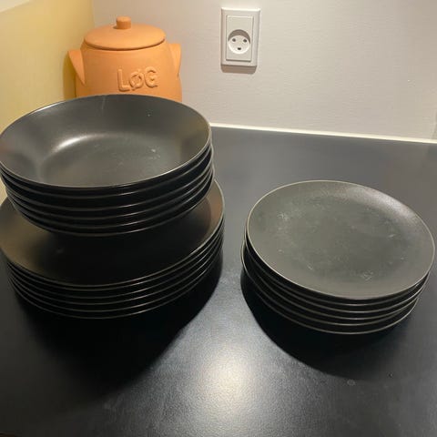 Et komplet sæt på 40 dele i olivengrøn farve bestående af 8 middagstallerkener, 8 suppe tallerkener, 8 forrets tallerkener, 8 små skåle og 8 kaffekopper sælges.