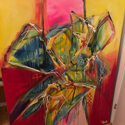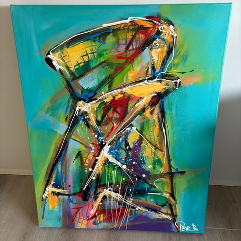 Per B maleri abstrakt kunstværk på lærred. Dette flerfarvede kunstværk har en dynamisk og livlig komposition med stærke farver som rød, blå og grøn. Perfekt til at tilføje et kunstnerisk touch til ethvert rum.