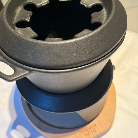 Jelling fondue-Grilltallerkener, 2 stk. Støbejern fondue/grilltallerkener i mat sort emalje med korkbakke. 24 cm i diameter. Aldrig brugt. 75 kr pr stk.
