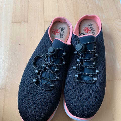 Sporty sko med kilehæl i hvid med rosa detaljer. Skoen har lynlås, snørre og en blød skinddæksål.