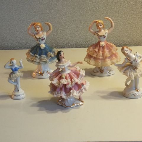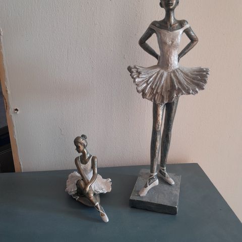Figurer, Ballarinaer, 2 balletdanserinder. Stående - diameter 6 cm højde 19 cm. Siddende - 10 x 20 cm højde 9 cm. Lavet i plast eller træ, jeg ved det ikke. Pynteting. Pynt. Nips. Pris pr stk. kr. 30,-. (Samlet køb kr. 50,-)