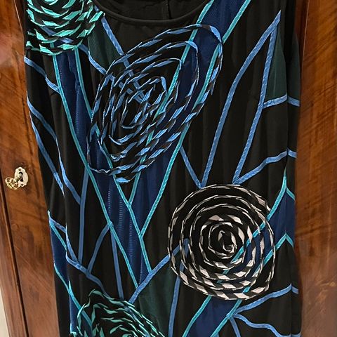 Molly Jo kjole i multifarvet design. Kjolen er i størrelse 44 og har et unikt mønster, der kombinerer forskellige farver. Er en alsidig tilføjelse til garderoben, velegnet til forskellige lejligheder.