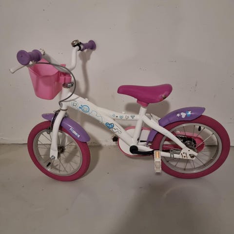 3) (to billeder) Lyserød med håndbremse og stang - ikke så køn længere, men super stabil; kun 125 kr.