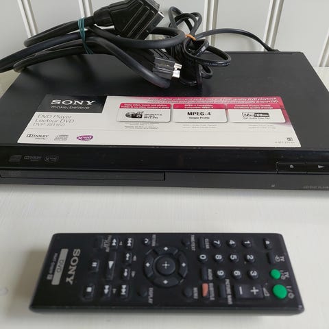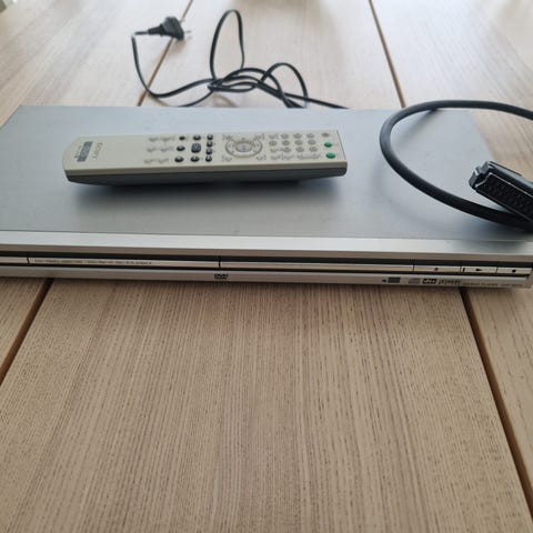 Kosmetisk skade på fronten. Limet og fungerer fint. Fjernbetjening og dvd fungerer fint. Scart stik medfølger.