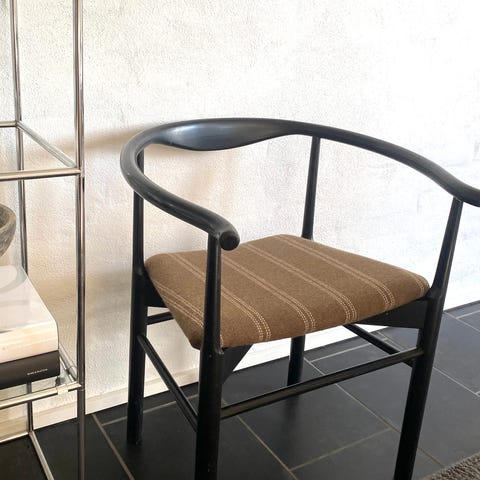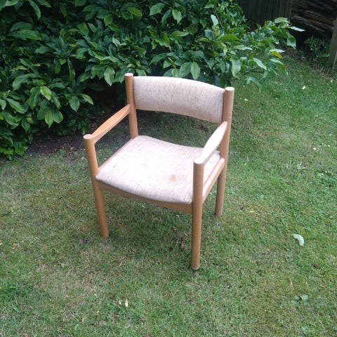 En fed ældre armstol i mørkbejdset træ. Træet kunne godt bruge lidt olie på armlænene. Stoffet er pænt med patina;)