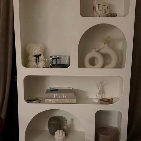 En reol med åbne hylder, der giver masser af plads til dekorationer, kurve og vaser eller bøger til den klassiske boligindretning.