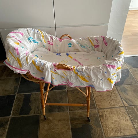 kurvevugge med sengeramme i lyserød samt himmel i hvid og hvid madras meget velholdt.. brede 58cm, længde 80cm