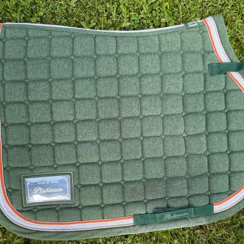 Mørkeblåt springunderlag med grå kant og stenkant i størrelse 16. Har selv brugt det til en maks 1’er pony og været rigtig glad for det.