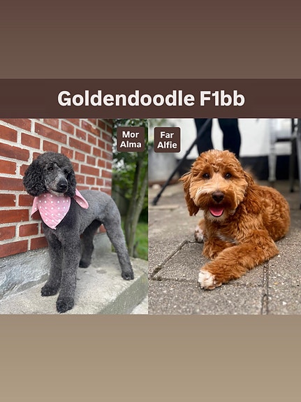 Hundemor til kuldet er en creme Goldendoodle F1 og hundefar er en smuk rød puddel.
