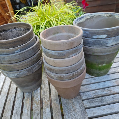 Mellem potter 2 stk - højde 15 cm, diameter 23,5 cm. 50 dkk pr. stk.