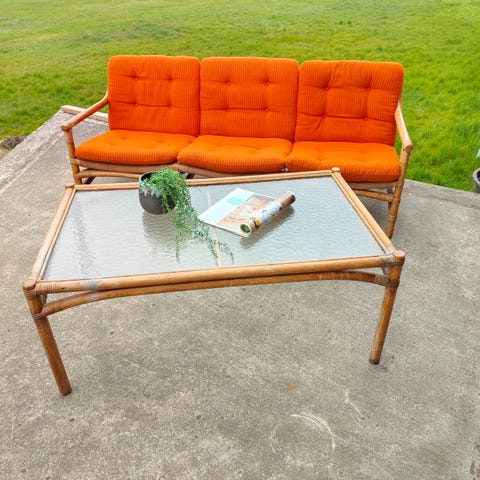 Smukt retro bambus sæt som består at fire ens stole med tykke vendbare hynder og et glasbord med en tremmehylde under.