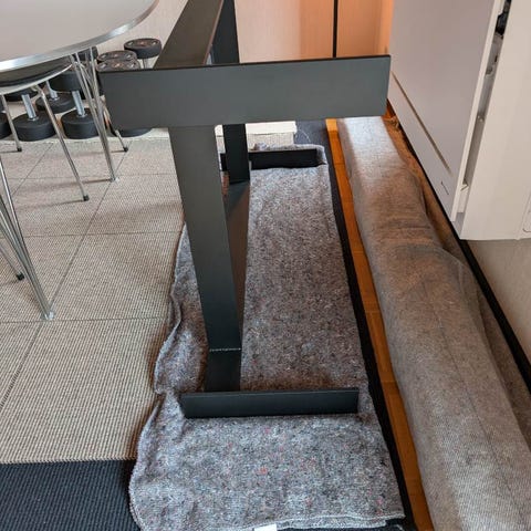 Benene kan nemt skrues af og på, med gummi propper, så det ikke ridser gulvet. Bordet er ovalt æggeformet.Det er meget stabilt og man kan sidde på det.