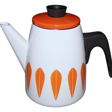 Retro emalje kaffekedel fra 1960’erne med orange dekoration.