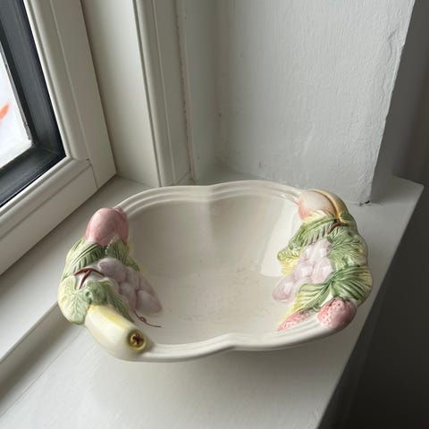 Frugtskål frugtfad opsats skålpåfod hvide fugle romantisk indretning romantik