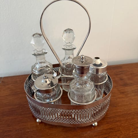 Sølvtøj, Plat menage, NY LAVERE PRIS, Flot gammel plat menage i sølv (plet) med plads til fire flasker. Er blevet brugt til peber, salt, olie og eddike, men kan også bruges til andet efter eget valg - feks. dresssinger. Har en fin udskåret kant på det midterste brede stykke. Sælges for 300 kr.