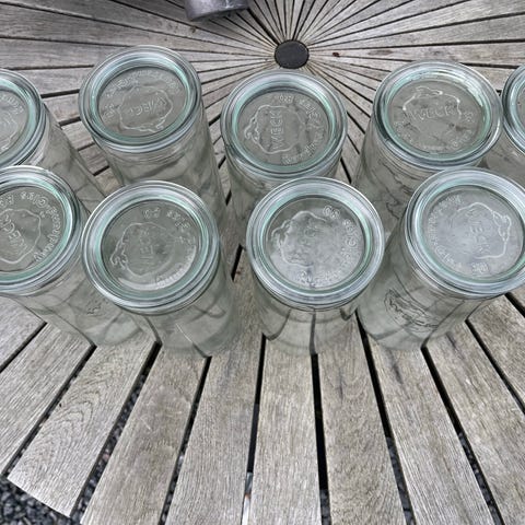 Wick Werke - Vintage keramik sæt. Sættet inkluderer en stor krukke med låg- punchbowle og seks matchende krus. Detaljeret dekoration med motiver og bladmønstre. Ideel til samlere eller som dekorativt element i hjemmet.