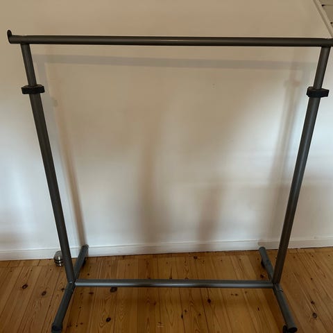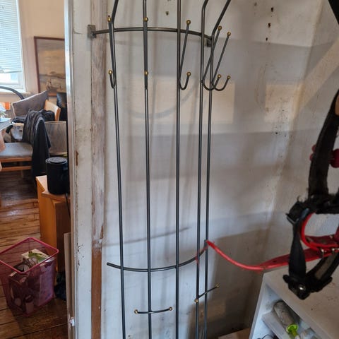 Metall stativ i sort farve med flere kroge til ophængning. Stativet er velegnet til opbevaring af forskellige genstande og kan anvendes i både indendørs og udendørs miljøer. Designet er enkelt og funktionelt, hvilket gør det nemt at integrere i forskellige indretninger.
