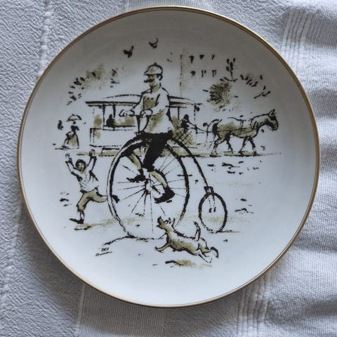 Hver platte har en unik dekoration i sort-hvid, der viser forskellige aspekter af bylivet, såsom skøjteløb, cykling og hestevogne.