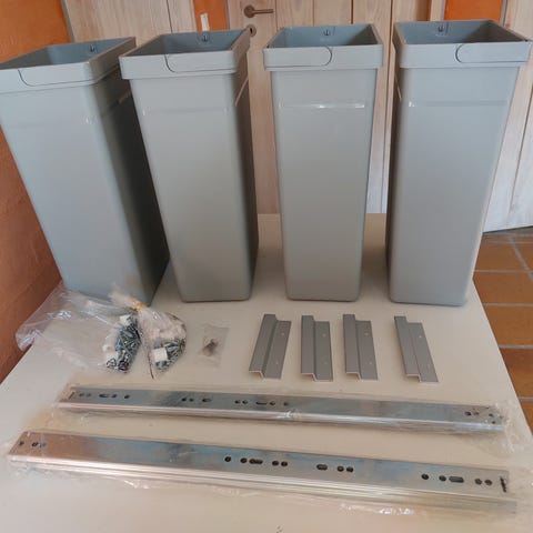 Affaldssystem eller skraldespand med 3 spande og udtræk. Fungerer som nyt. H 41 cm x L 53 cm x B 26 cm