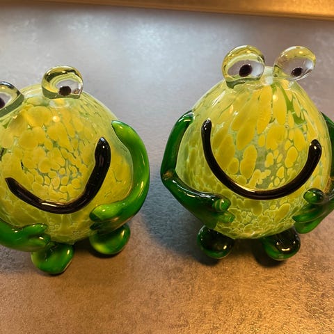 2 dekorative grønlige glasdråber. Lavet for Grundfos som medarbejder gaver. Ingen skår. Ca 10 og 11 cm høje. Samlet pris 75kr. sender gerne men ikke med fiks færdig