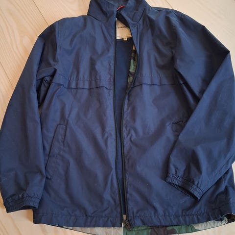 Rigtigt fin overgangsjakke i softshell med foer i fleece indvendig og refleksstjerne bag på alle lyslåssnollerne er også med refleks, elastik i ærmerne og kanten for neden, mulighed for at knappe en hætte på men den er blevet væk og sælges derfor uden hætte. alle lynlås virker fint og elastikken er stadig god elastisk.