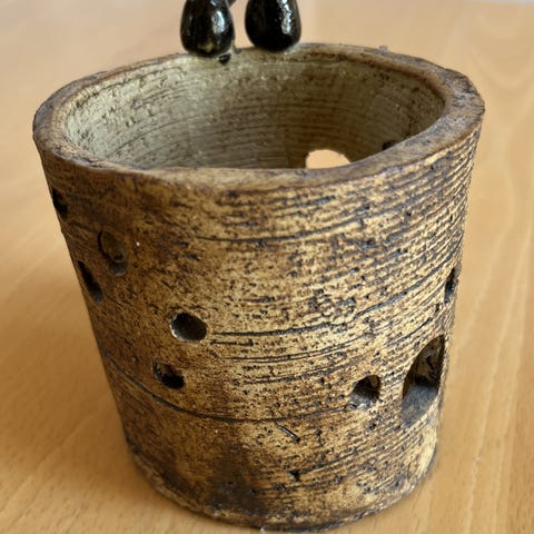 Stort, flot kræmmerhus i hvidler med mønstre/mørke nuancer. Hul i bagside til vægophæng. Umærket.