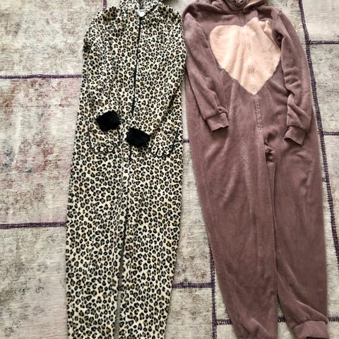 Hyggedragt i størrelse 146/152 (den er noget mindre end størrelsen der er angivet i den, derfor jeg har skrevet 134 i størrelse) af mærket Pepperts i hvid med lyserøde hjerter og grå omridser af hjerterne, lavet i fleece med to små ører på hætten.