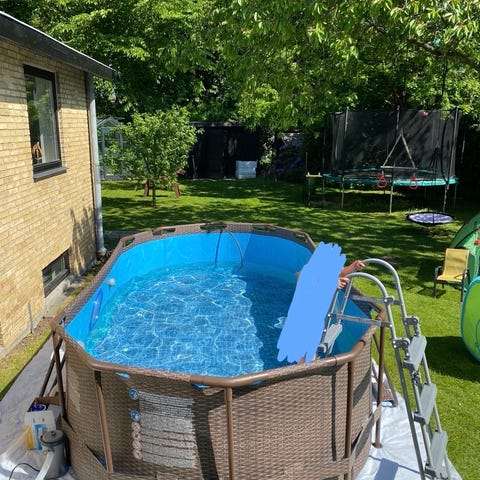 Bestway Steel Pro Max rund pool sæt med stålramme og blå indvendig mønster. Sættet inkluderer pool, filterpumpe og tilbehør til vedligeholdelse. Poolen har en diameter på ca. 3,96 meter og en højde på ca. 1,22 meter. Filterpumpen fra Swim & Fun er købt separat og har en højere pumpekapacitet end pumpen der var inkluderet.