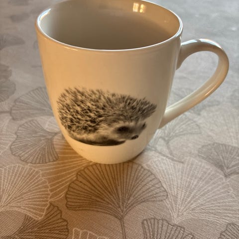 Rigtig fin skål med et sødt pindsvin, se cirka højde på billed hvor det er målt ud fra finger og hånd. Meget fin og står fint. Sødt motiv.