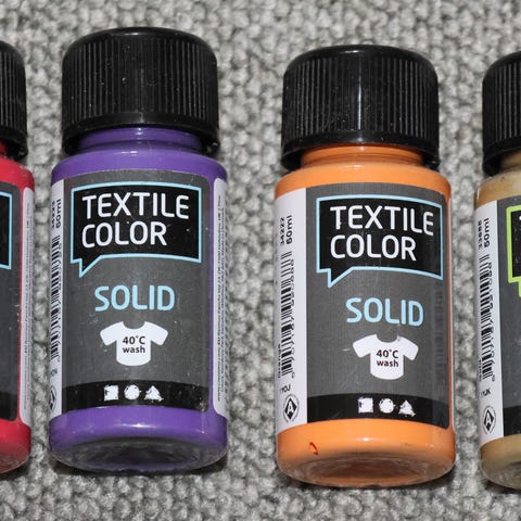 Tekstilfarverne er permanente, dækkende og vandbaserede, tørrer på stoffet og danner en blød, fløjlslignende tekstur.