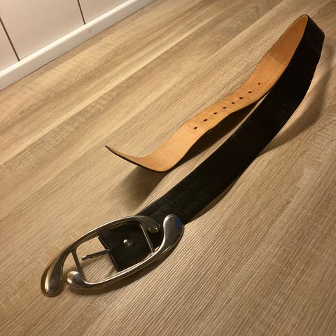 Blødt beige skindbælte med ovalt sølv spænde viklet med skind. Længde fra spids til spænde 117 cm. Passer også str. 46 og 48