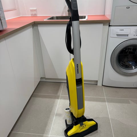 Kärcher EWM2 gulvrenser i gul farve. Denne gulvrenser er designet til effektiv rengøring af hårde gulve og kombinerer både støvsugning og vask i én arbejdsgang. Den er udstyret med roterende ruller, der sikrer en grundig rengøring og efterlader gulvet tørt. Ideel til hjem med træ- eller flisegulve.