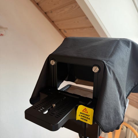 Brug din mobiltelefon som teleprompter vha. en app og denne boks. Ringe til montering på diverse størrelser af kameraobjektiv medfølger. Kan tages med til Kbh.