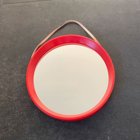 Super fint enkelt rundt retro spejl i flot varm gul farve i plast med rem til ophæng.