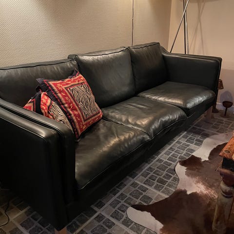 Sort lædersofa med plads til tre personer. Sofaen er lavet i læder, og er i god stand.