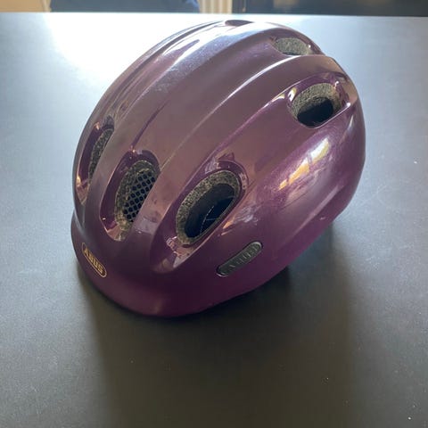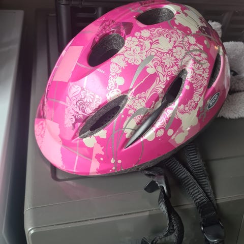 Meget fin cykelhjelm, der er lyserød med blomster. Den er brugt få gange, dog har der været en hvalp i den og afsat nogle bidemærker.
