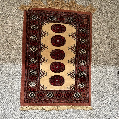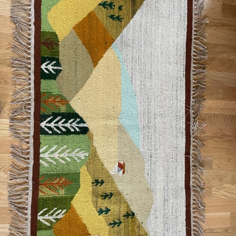Det er lidt falmet, og lidt gulligt nogle steder, men stadig et flot tæppe.