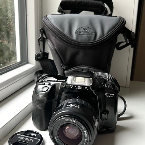 Analogt SLR-kamera fra Minolta, model Dynax 500si. Kameraet har autofokus, automatisk filmindspoling og indbygget blitz. Kommer med original Minolta-linse (zoom 35–80mm) og frontdæksel. Perfekt til analog entusiaster og filmfotografi.