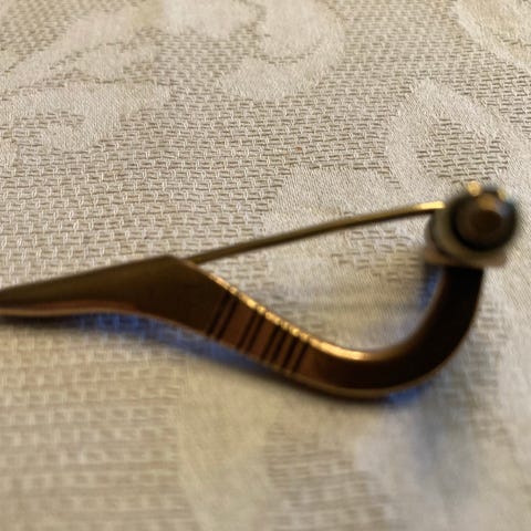Skøn bronze broche. Designet fra finske juvelerfirma Kalevala Koru. Inspireret af vikinge smykkefund, i form af et skjold. Vintage 1950-55. Måler 5,5cm x 2,6cm. Smuk stand. Stemplet made in Finland KK.