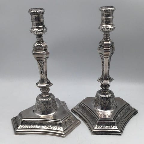 Dansk tretårnet sølv, par fire-armede kandelabre.