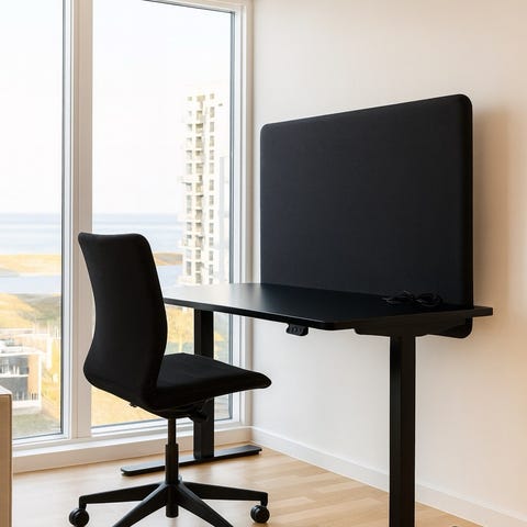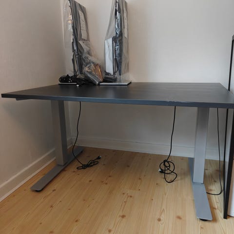 Sælges 2 stk. el-hæve/sænke borde med 2 stk. MOMO kontorstole, samt 2 stk. Stoleunderlag 1200x1800x3 til hård gulv uden pigge PVC.