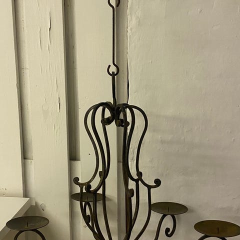 Julegave: Fin gammel lysekrone i smedejern. 5 armet. Fin med levende lys, men mere anvendelig med led-lys.