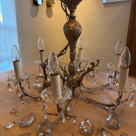 2 stk prisme lysekroner, de er omkring 85 høje og 72 brede. Der mangler få prismer.