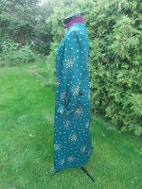 Lang lynlås i ryg. Mørkegrønt polyester med små blomster i gule/lyserøde/røde/lysegrønne farver. Umærket.