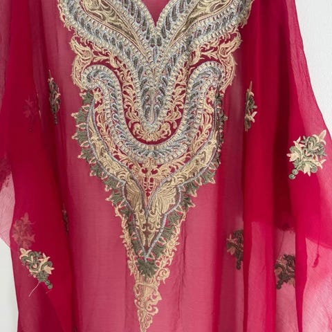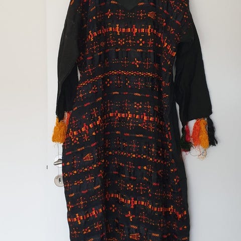 Originalt stof med trykt mønster, købt i Kenya. Ca. 115 m bredt, 5,49 meter.