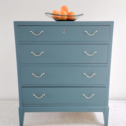 Fint lille retro bord/kommode med mange muligheder. Det er nyrenoveret og nymalet i farven Ash fra Fusion, som er en miljøvenlig maling. Skufferne er pæne indvendig og kører godt. Skuffegreb og messingsko er ny polerede.