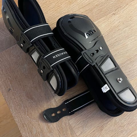 Bagbensgamacher med kraftigt refleks velcrobånd. Med blød polstring og god støtte